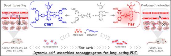 对于光动力(PDT)纳米诊疗而言,开发兼具高活性氧物种(ROS)生成效率、良好肿瘤靶向能力和肿瘤滞留特性的有机荧光纳米材料至关重要。然而,目前的光动力治疗试剂大多为基于供体(D)和受体(A)特征的对称型D-A-D型分子,其纳米材料通常是微小的球形颗粒,虽然可以通过EPR效应实现良好的肿瘤靶向,但该类材料的肿瘤滞留时间较短。因此,如何设计并构筑具有合适尺寸的棒状纳米体系以延长其瘤内停留时间,是目前光敏材料研究领域的一大挑战;尤其通过分子设计,在实现高ROS生成的同时,整合肿瘤靶向性及长滞留性等生物学优势于一体的形态可调型光敏材料更是鲜有报道(图1)。